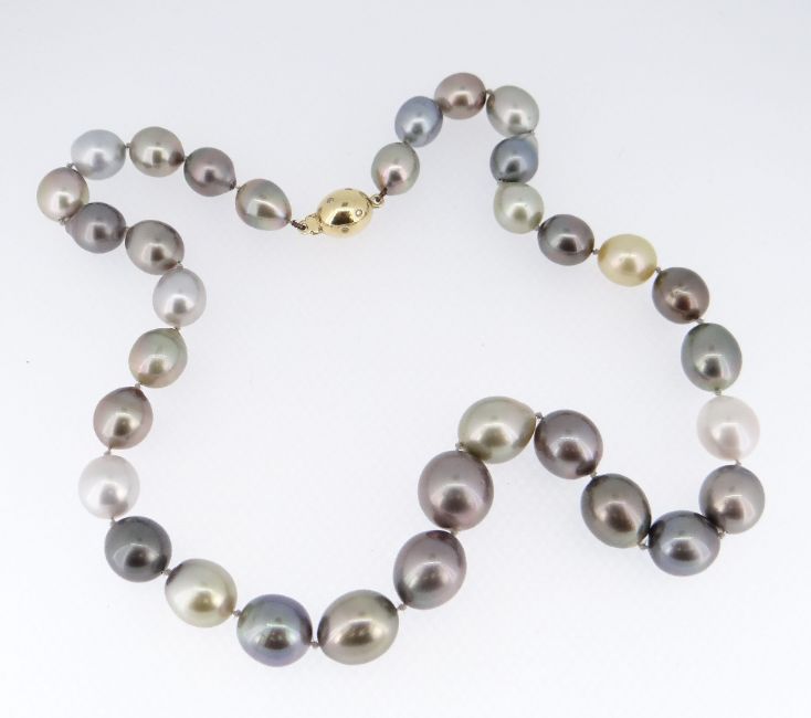 TAHITIAN SOUTH SEA PEARL NECKLACE with 18ct gold diamond set oval ball clasp, 33 mixed natural colour pearls in grey, green, blue, gold and white, varying between 12 and 14mms, 74gms gross, 48cms overall length