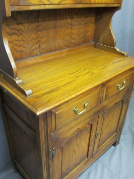 REPRODUCTION OAK GLASS TOP DRESSER having twin six pane glazed doors with interior shelves and brass H hinges over a two drawer two door base section on style feet, 182cms H, 90cms W, 43cms D