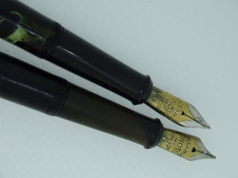 TWO VINTAGE ONOTO 'THE PEN' No 6235 FOUNTAIN PENS - (1930s -1940s) De La Rue with gold plated trim and Onoto No.5 14 ct gold two-tone nibs. One Green Marble; one Chased Black celluloid. Both missing pocket clips