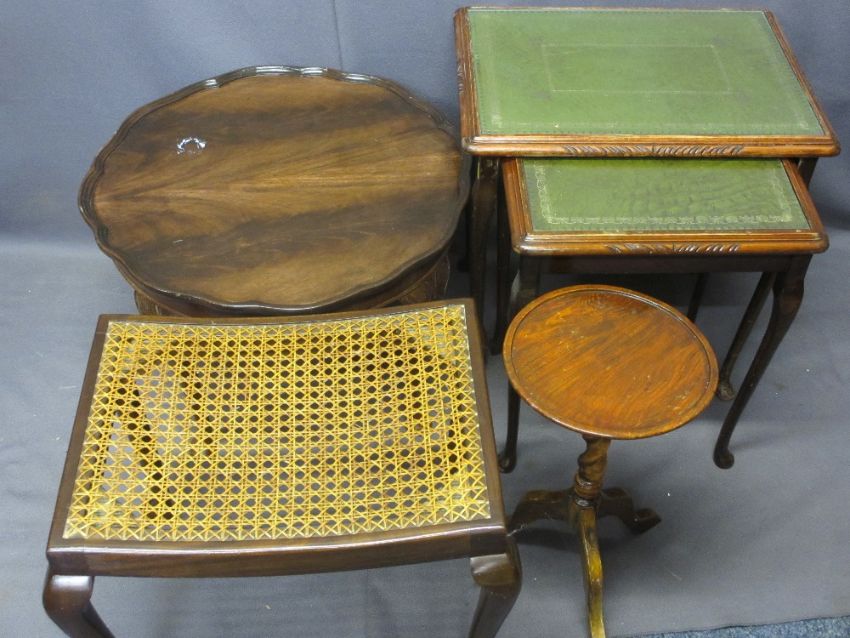 VINTAGE & LATER FURNITURE PARCEL, four items including a mahogany circular top table with shaped edge, 43cms H, 58cms D, canework top stool, 44cms H, 52cms W, 37cms D, oak barley twist wine table, 26cms diameter top, 46.5cms H and two reproduction glass top occasional tables with gilt tooled green leather inserts, 55cms H, 53cms W, 39cms D the largest