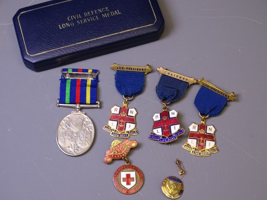 REGALIA - a cased Civil Defence long service medal with ribbon and a small parcel of RNLI and other related yellow metal and enamel badges with ribbons