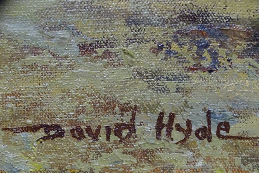 DAVID HYDE oil on canvas - busy harvesting scene with hay laden cart and horses with numerous figures, signed, 48.5 x 60cms