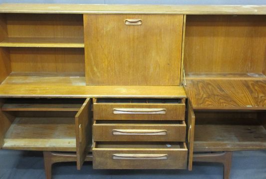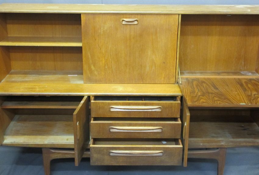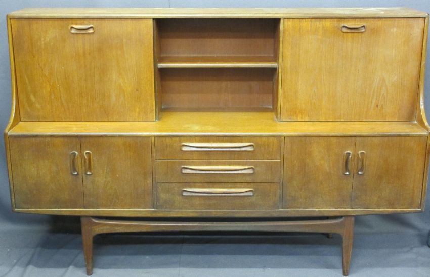 G-PLAN OR SIMILAR MID-CENTURY SIDEBOARD with upper section sliding and drop down doors, 121cms H, 190cms W, 46cms D