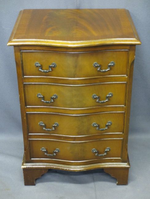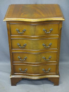 REPRODUCTION MAHOGANY SERPENTINE FRONT CHEST of four drawers on corner bracket feet, 72cms H, 49.5cms W, 40cms D