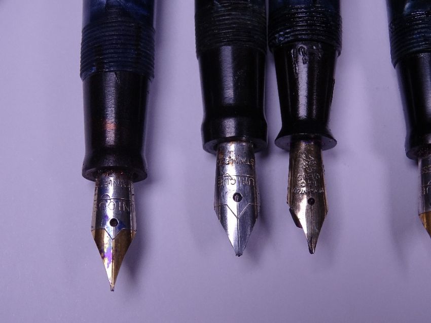 UNIQUE PENS (13) - The Unique Pen fountain pens, 10 with Warranted 14ct gold nibs, from one of the lesser known pen manufacturers. Made in England around the 1940s to early 50s. Also one unmarked fountain pen with "Cracked Ice" style marbling and Voss 14ct gold nib and one Green and Black marble 'Kingswood' fountain pen with Warranted 14ct gold nib.