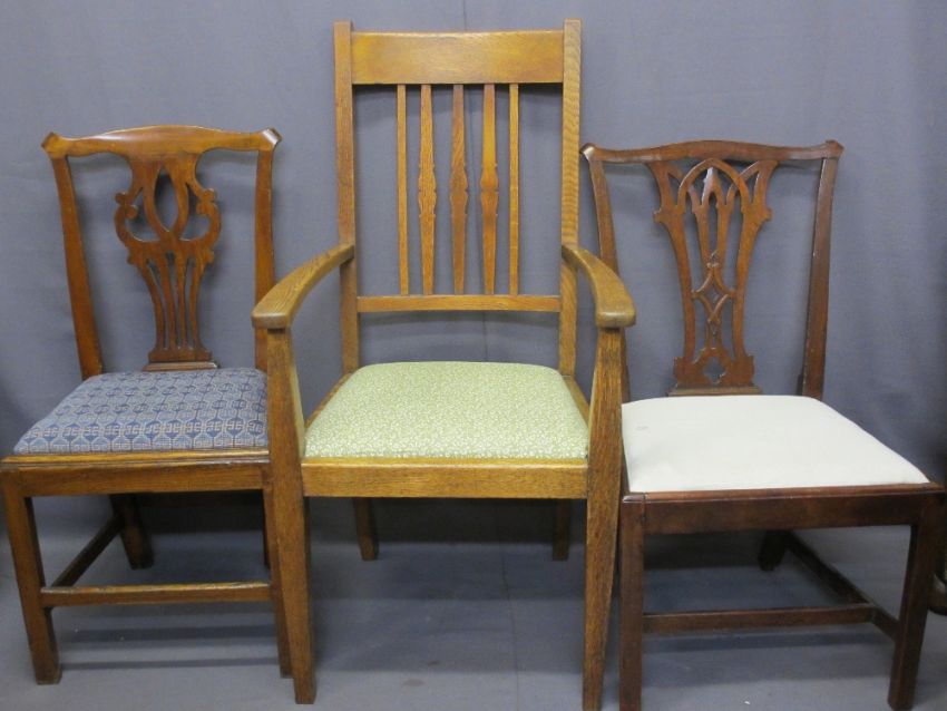 FOUR ANTIQUE OAK SIDE CHAIRS and a vintage oak armchair, various styles, dates and measurements