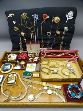 VINTAGE & LATER JEWELLERY, lady's wristwatches and collectables on a two-handled oak tray including a fine link 9ct gold necklace with padlock pendant, rhinestone set poppy brooch, needlework tape measure in the form of a clock (AF), perspex type fox brooch and other interesting items