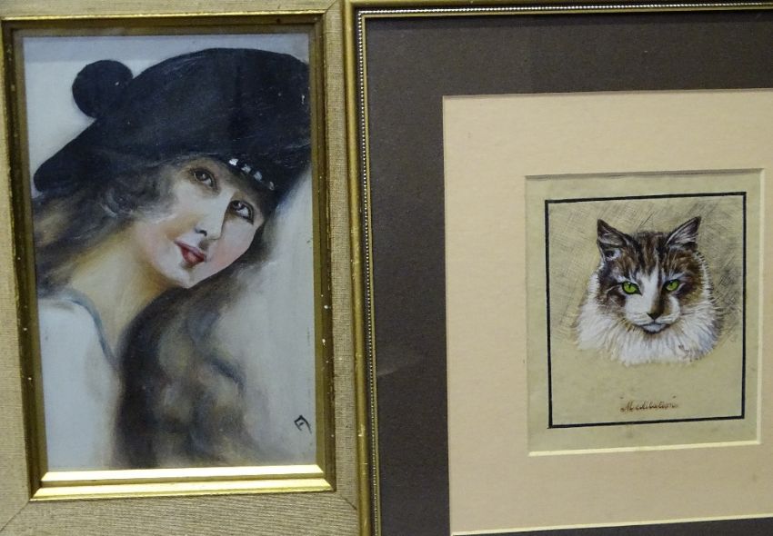 ART DECO PORTRAIT - a lady, initialled F J, Oil on Board, 22 x 14cms and Watercolour of a cat, initialled W H 1931