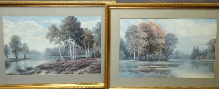 SORENSEN BERLIN prints, a pair of lakeside scenes, 46 x 71cms. Antique prints, framed silks ETC