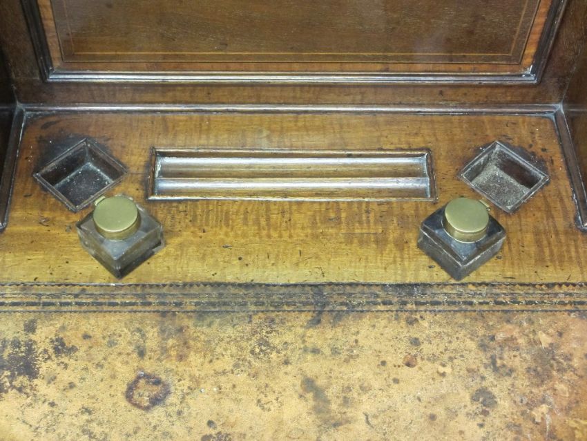 EDWARDIAN INLAID MAHOGANY LADY'S WRITING DESK with shaped railback over a central rectangular panel and inset pen rest and brass top glass inkwells, flanked by twin sets of drawers, the top having tooled leather insert above twin frieze drawers on tapering supports with brass cup and brown pot castors, 104cms max H, 92cms W, 50cms D