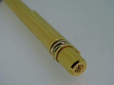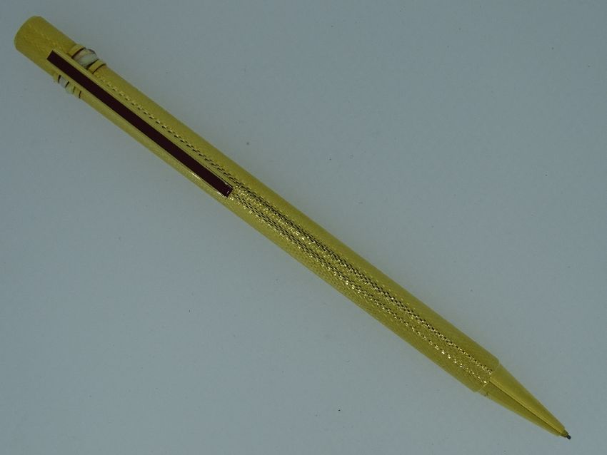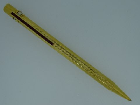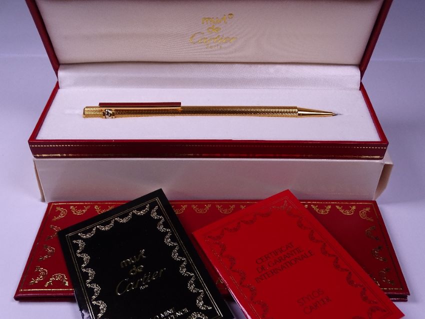 CARTIER MUST DE CARTIER TRINITY 3 ORS MECHANICAL PENCIL - Vintage 1990s Textured Gold Plated with red enamel clip and signature trinity rings in white, yellow and rose plated gold. In original leather Cartier presentation case with outer sleeve and guarantee, certificate with serial number and instruction booklet all in Cartier leather holder. In unused condition