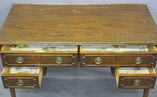 REPRODUCTION MAHOGANY DESK, rectangular top over two long drawers and two smaller with brass ring pull handles, on splayed feet, 80cms H, 112cms W, 51cms D