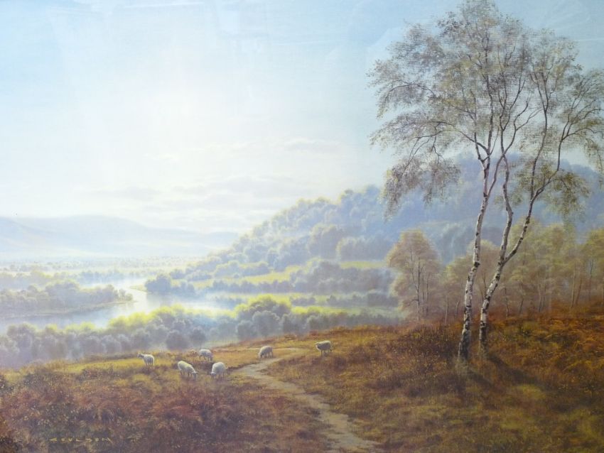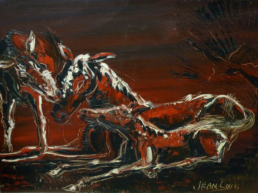 JEAN LOUIS oil on canvas - horses at rest in abstract colours, 44 x 60cms, COULSON expansive landscape, 50 x 74cms and a quantity of other framed silks, prints ETC
