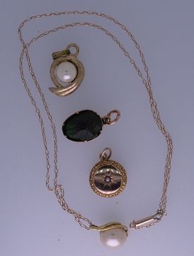 A NECK CHAIN & FOUR PENDANTS - a yellow metal oval link neck chain with yellow metal mounted pearl pendant, 2.8grms, a yellow metal mounted pearl pendant, 3.4grms, a circular yellow metal star and pearl pendant, 1.2grms and an oval nine carat gold mounted scarab pendant, 1.2grms