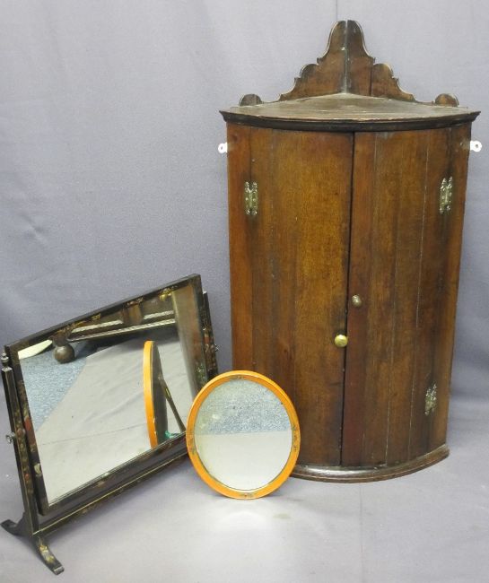 ANTIQUE & VINTAGE FURNITURE, three items including a twin door oak bow front hanging corner cupboard with shaped rail top, brass H hinges and interior shelves, 109cms H, 58.5cms W and two chinoiserie decorated dressing table mirrors, black rectangular example on stand, 51cms H, 56cms W and an orange oval on an easel stand, 33.5 x 27cms