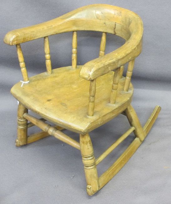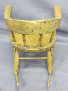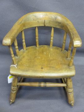 CHILD'S ROCKING ARMCHAIR, Victorian with spindle gallery bow back, 40cms H, 34cms max W, 26cms seat D (slight worm evidence)
