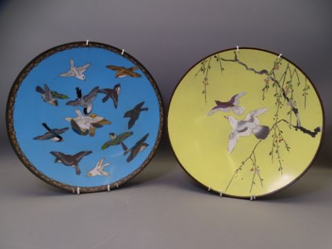 CLOISONNE - two chargers, 1. blue ground with flying birds and, 2. yellow ground with two flying birds and blossom trees, each 30cms diameter