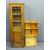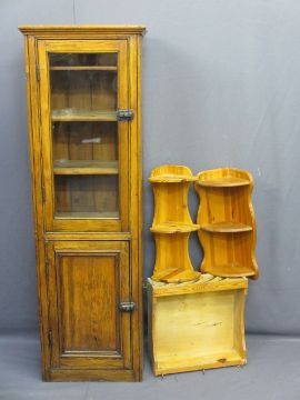 STRIPPED PINE STANDING KITCHEN CABINET and three modern pine wall shelves, the standing cabinet with single glazed upper door and panelled lower door with interior shelves, 167cms H, 53.5cms W, 37cms max D