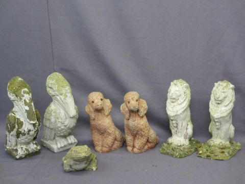 RECONSTITUTED STONE, GARDEN ORNAMENTAL WARE including a pair of seated lions, pair of birds, pair of dogs and a toad, 40cms H the tallest