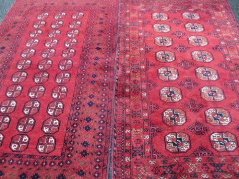 EASTERN STYLE WOOLLEN CARPETS (2) both red ground and similarly patterned multi-block central panels and multi-bordered edging, 188 x 110cms and 197 x 113cms