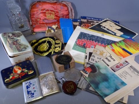 EPHEMERA, COMMEMORATIVE TIN, FOOTBALL COINS, aluminium and electroplate cigarette cases, decanters ETC