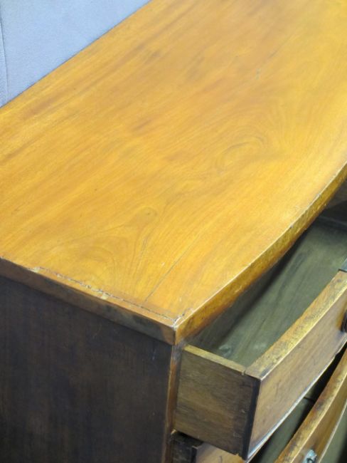 MID-19TH CENTURY BOW FRONT MAHOGANY CHEST of two short over three long drawers having classical circular backplates and wreath design ring pull handles, 93.5cms H, 98cms W, 46cms D