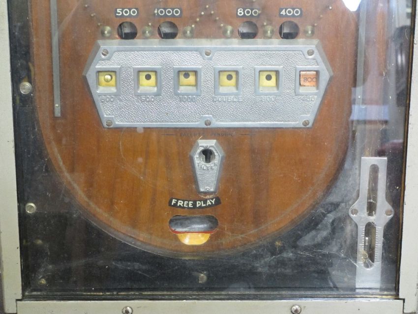 VINTAGE PINBALL MACHINE, wooden cased with glass cover and penny coin slot, tabletop model, not freestanding, 22cms up to 27cms H, 41cms W, 98cms overall max L