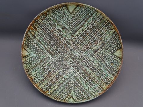 LARGE CIRCULAR ART POTTERY SHALLOW BOWL on a short pedestal, 37cms diameter, 12cms high