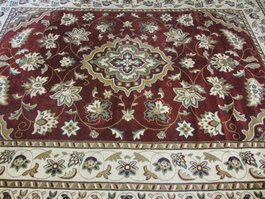 MODERN WOOLLEN LOUNGE CARPET, red and cream ground with repeating central pattern and multi-bordered edge, 236 x 242cms