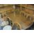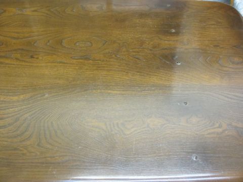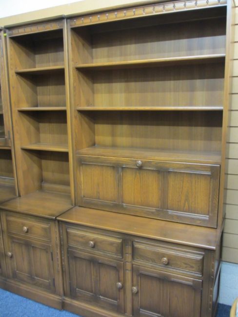 EXTENSIVE ERCOL DINING ROOM SUITE - Medium Oak, comprising refectory style table, 72cms H, 183cms L, 80cms W, seven (4 + 3) stickback dining chairs with stylised Fleur de Lys roundel to the back splats, dresser the three shelf rack with top frieze and corbel shelf supports on a base section of three frieze drawers and three lower cupboard doors on stile feet, 191cms H, 145.5cms W, 50cms D along with a three section wall unit having an arrangement of open shelves, glazed cupboard, drop down cocktail on base sections of drawers and cupboard doors, 196cms H, 246.5cms L, 50cms D (generally in tip top condition but there are some scratches and marks to the table surface)