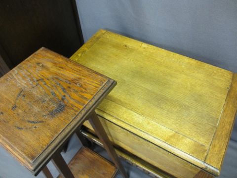 VINTAGE & MID-CENTURY FURNITURE PARCEL, four items including a single door hall robe with carved detail to the front, 182cms H, 79cms W, 51cms D, teak ceramic tiled top coffee table, 36cms H, 69cms W, 49.5cms D, twin-flap oak Priory style tea trolley, 71.5cms H, 67.5cms L, 41.5cms W and an Edwardian two-tier planter stand, 91cms H
