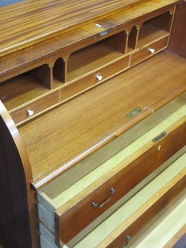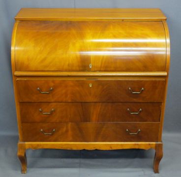 REPRODUCTION MAHOGANY CYLINDER FRONT BUREAU, the fall having interior arrangement of drawers and pigeonholes over three long drawers on shaped corner feet, 97cms H, 91cms max W, 46cms D