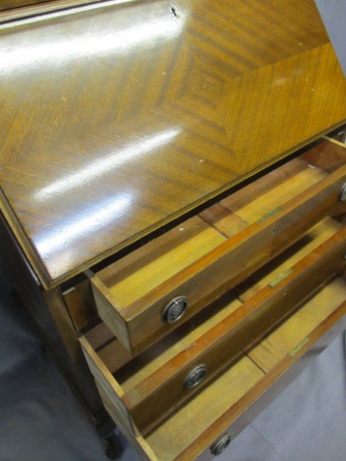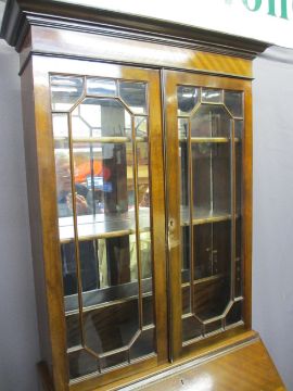 EDWARDIAN MAHOGANY BUREAU BOOKCASE/DISPLAY CABINET having upper nine pane astragal glazed doors, interior adjustable shelves with a mirrored back over a sloped fall having an interior writing service and an arrangement of pigeonholes and drawers, the base section with three long drawers on shaped supports, 202cms H, 78cms W, 46cms D