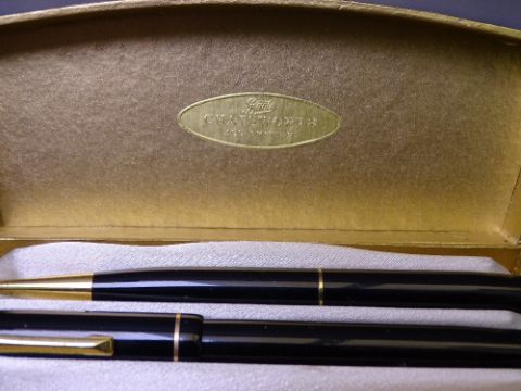 RARE BOOTS (BURNHAM) CHATSWORTH - fountain pen and pencil, boxed set, black with 14ct nib