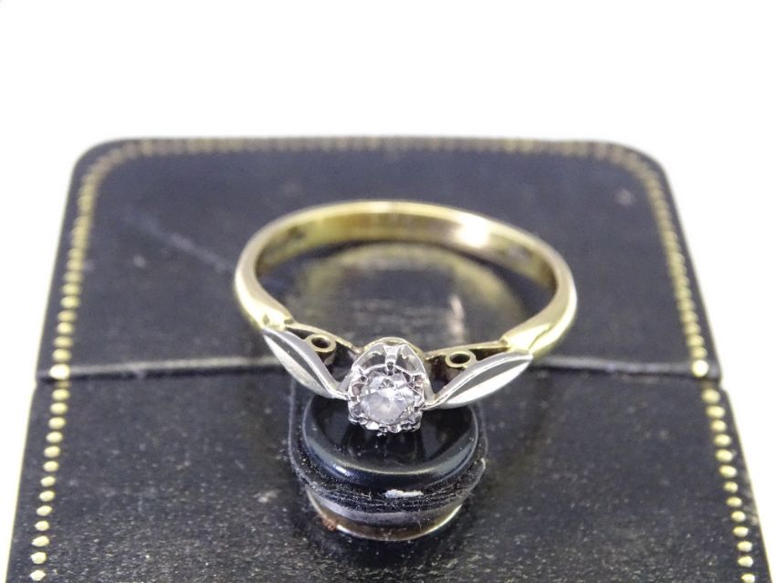 18, 9CT & GILT METAL JEWELLERY, six items including an 18ct gold diamond Solitaire ring, size mid O - P, 9ct gold cross on flat link necklace, 9ct heart shape locket on an 18ct gold necklace chain, unmarked yellow metal tie pin with black stone inset and two unmarked yellow metal necklace pendants, 18ct weighable, 5.5grms, 9ct weighable 4.5grms