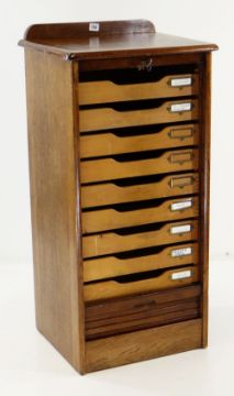 VINTAGE OAK TAMBOUR FRONTED OFFICE CABINET opening to reveal bank of nine document drawers, 41 x 47 x 98cms, inside drawer measurements 29 x 36cm's