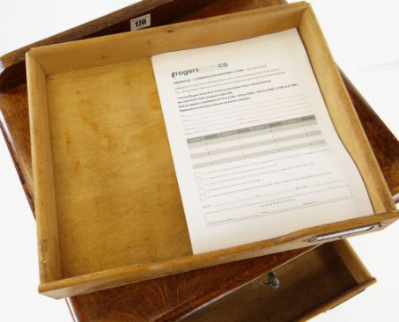 Rogers Jones & Co reserve the right to store or arrange for the storage of goods delivered to them for sale either on their own premises or elsewhere at their sole discretion.  They exempt themselves from any liability for loss or damage to goods delivered to their salerooms without sufficient sale instructions and reserve the right to take a minimum charge of £1 per lot per day for such goods (unless the loss or damage is caused by the negligence of their employees).