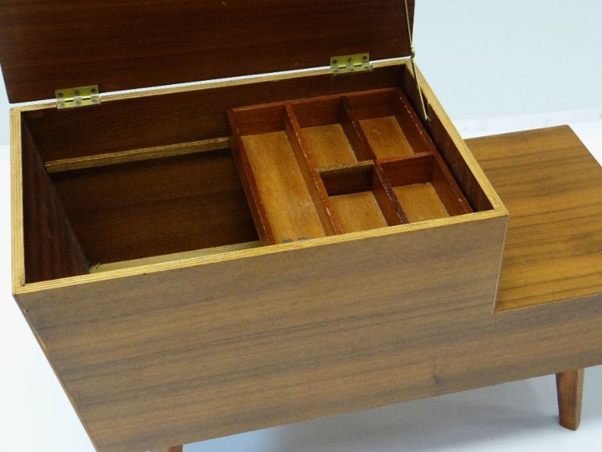 VANSON TEAK WORKBOX with rising lid and two side drawers, tapering square legs, 76 x 33 x 46cms