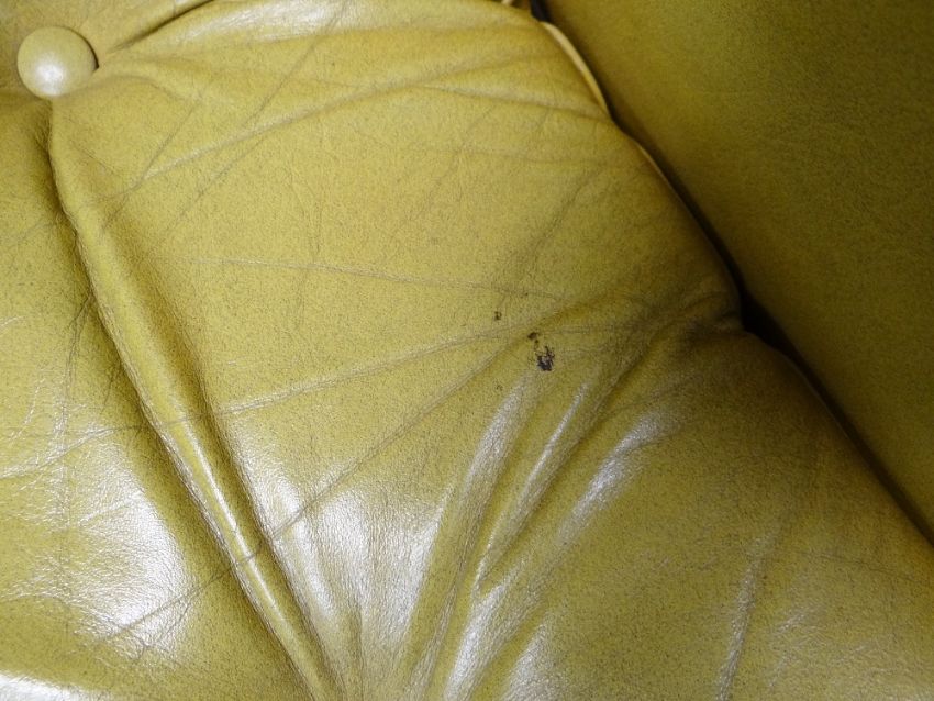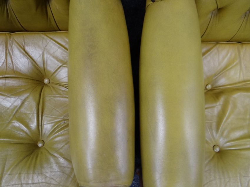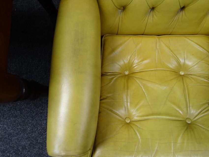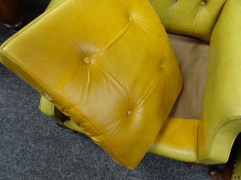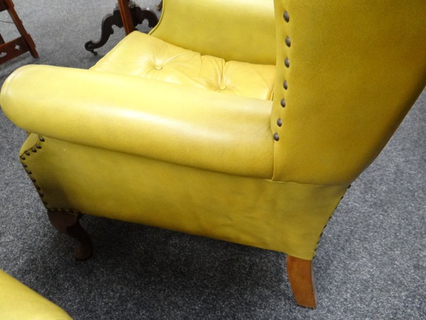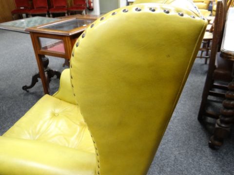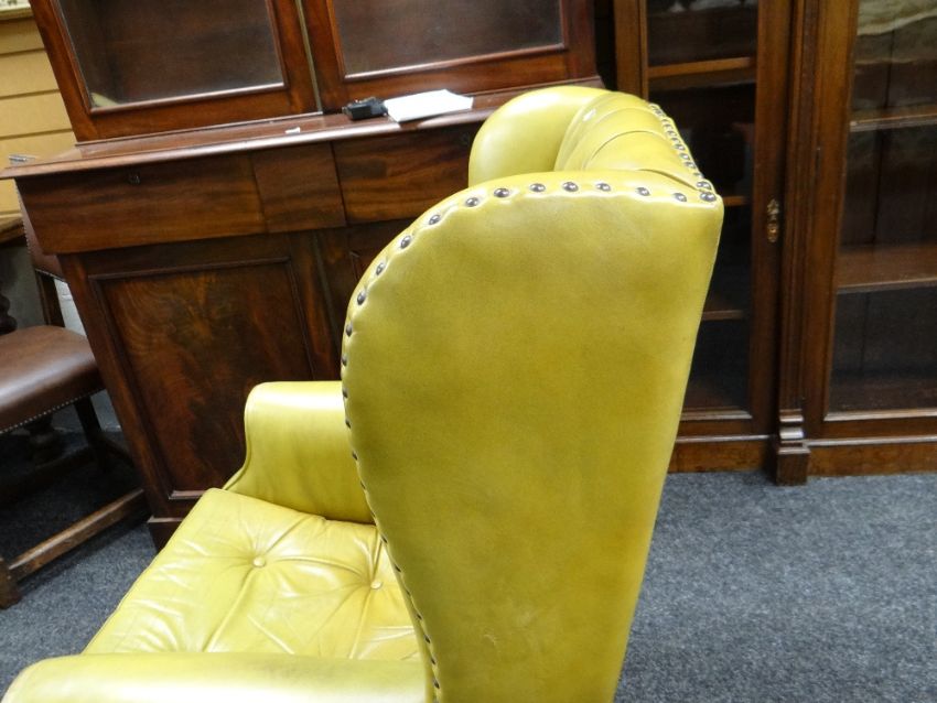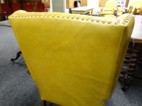PAIR GEORGIAN-STYLE WINGBACK ARMCHAIRS, button upholstered in mustard leather (faded) (2) COLLECTING ITEMS STRICTLY BY PRE-ARRANGED APPOINTMENT / SAFE DELIVERIES CAN BE ARRANGED (PLEASE ENQUIRE)The seat height is 40cm’sThe seat width is 44cm’sThe seat height at back (total height) is 96cm’sWidth including the arms – 72cm’sAll the buttons are presentThere are no rips or tears.There is some general wear to the arms along the seams.There are a few scratches to the legs and there is some staining / fading to the cushions, the underside look an orange colour.Both chairs feel solid, no wobble.