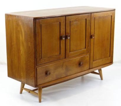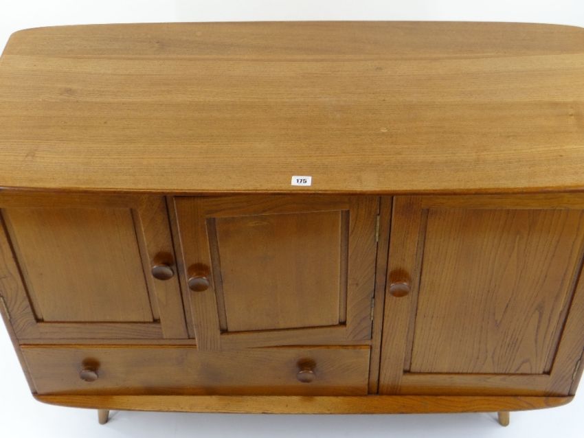 MID-CENTURY ERCOL GOLDEN ELM SIDEBOARD, model 467, fitted cupboards and apron drawer, splayed beech legs, 114 x 51 x 82cms