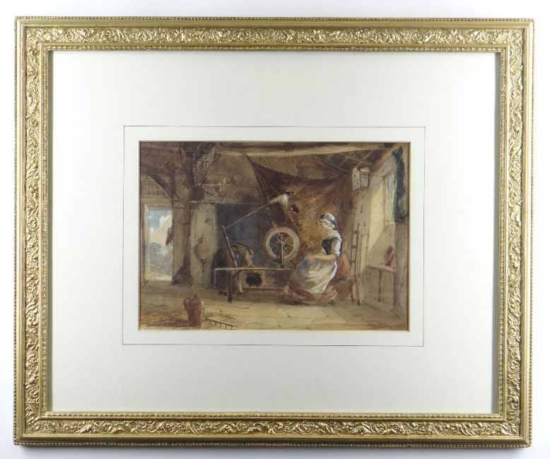FOLLOWER OF EMILE AUBERT LESSORE (French 1805-1876) watercolour - At the Spinning Wheel, bears signature and dated 49, 21 x 30.5cms