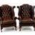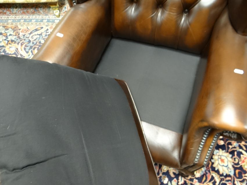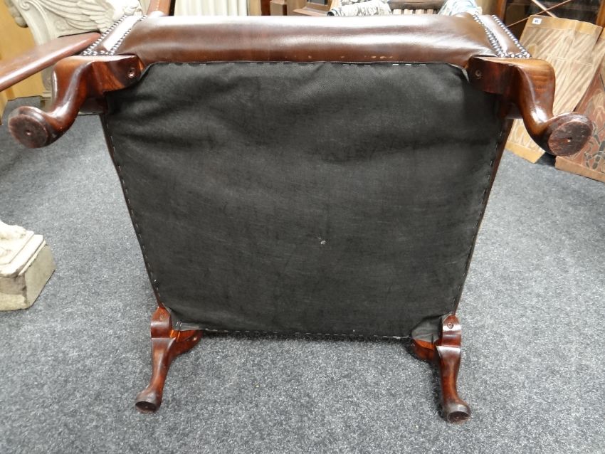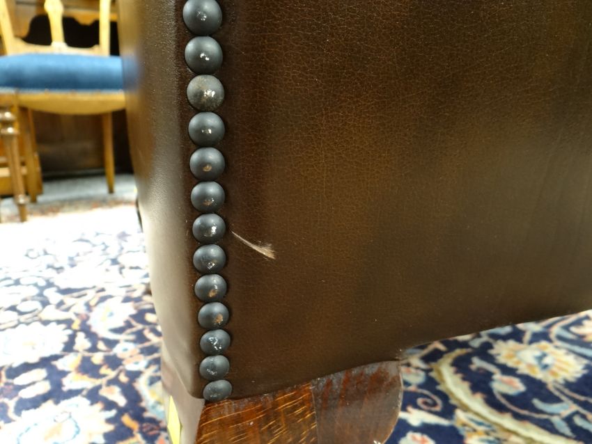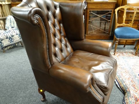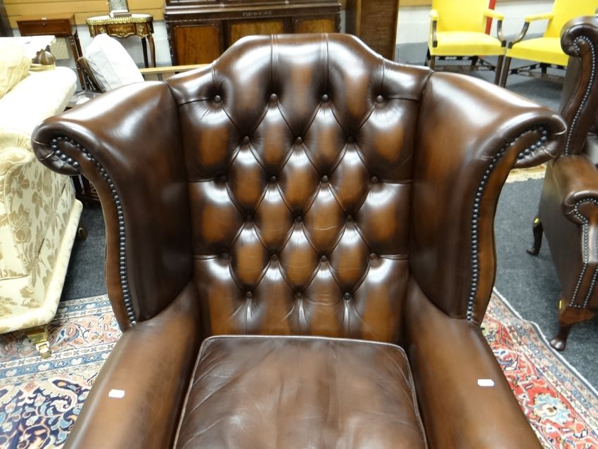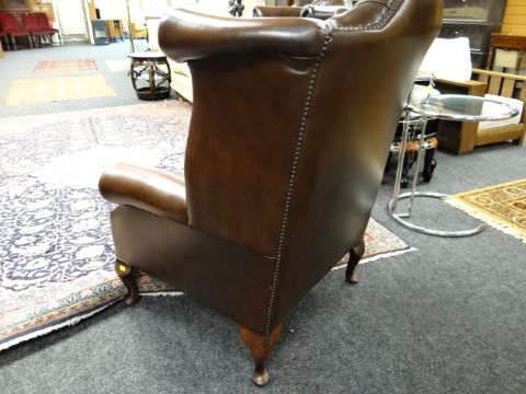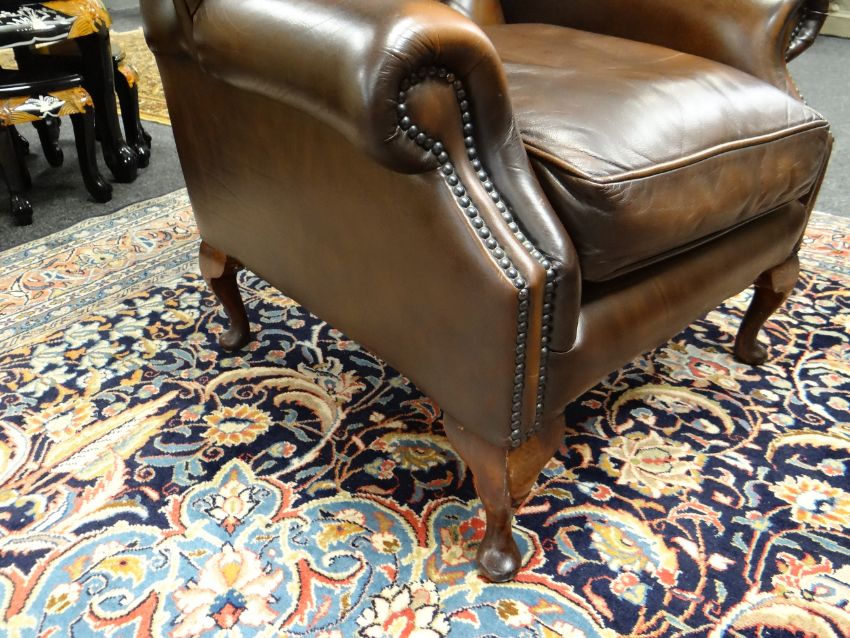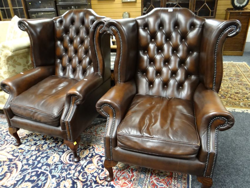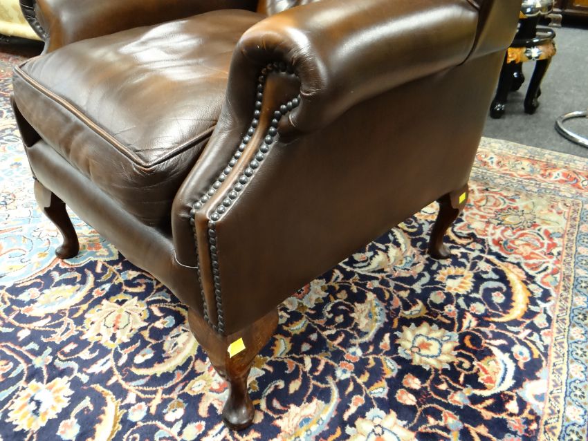 PAIR GEORGIAN-STYLE BROWN LEATHER WINGBACK ARMCHAIRS, by Whittle Bros. of Warrington, button-upholstered backs with loose seat, cabriole legs (2) COLLECTING ITEMS STRICTLY BY PRE-ARRANGED APPOINTMENT / SAFE DELIVERIES CAN BE ARRANGED (PLEASE ENQUIRE)There is one small mark on the back of one chair, hardly noticeable.There is no other damage. No splits, major cracking, all buttons present.Both chairs look very good.