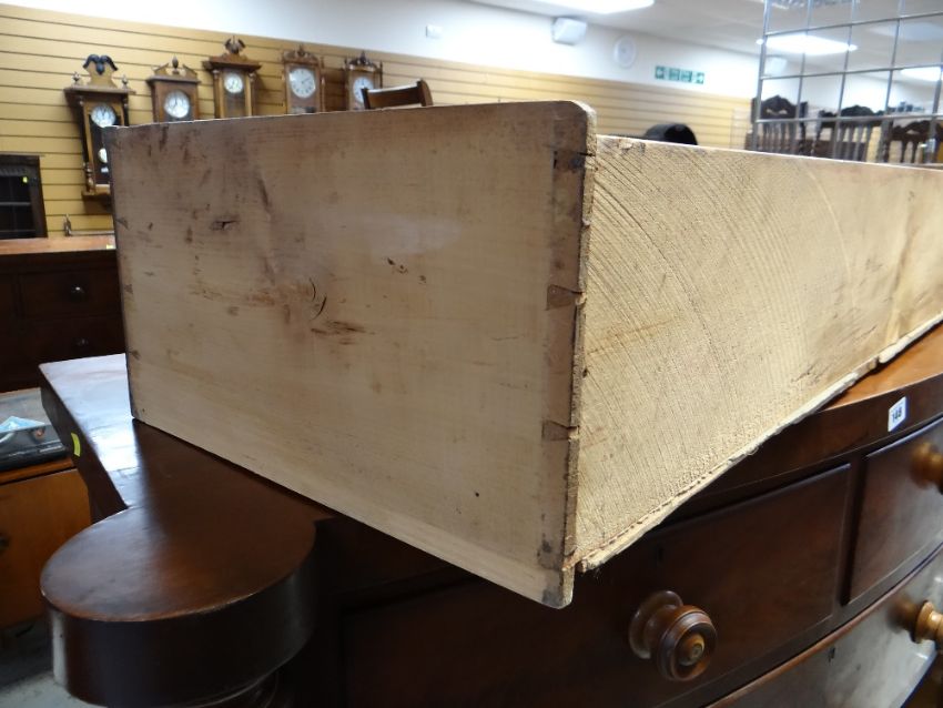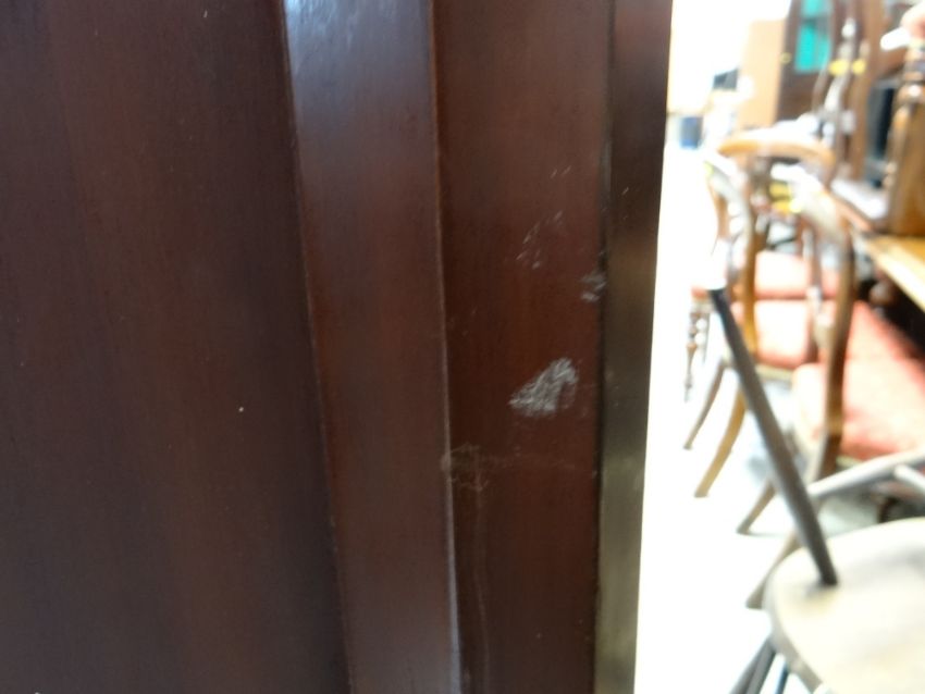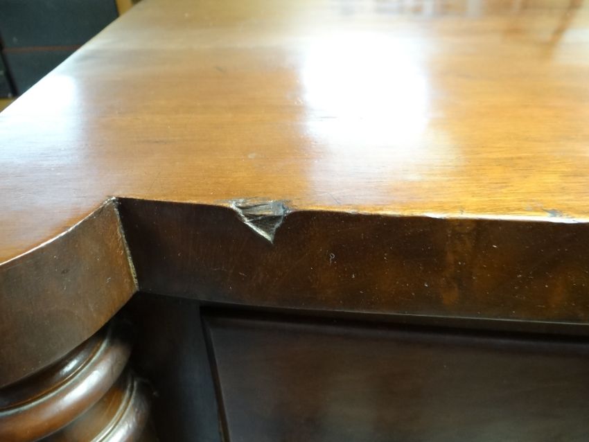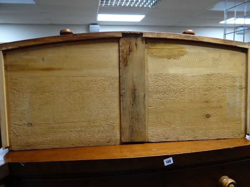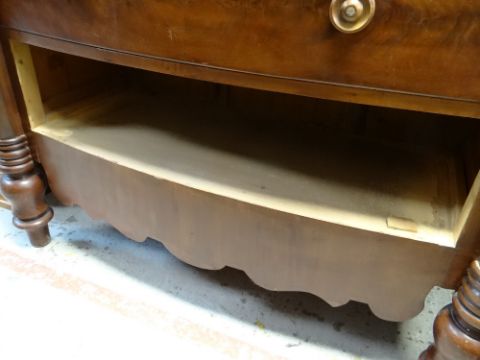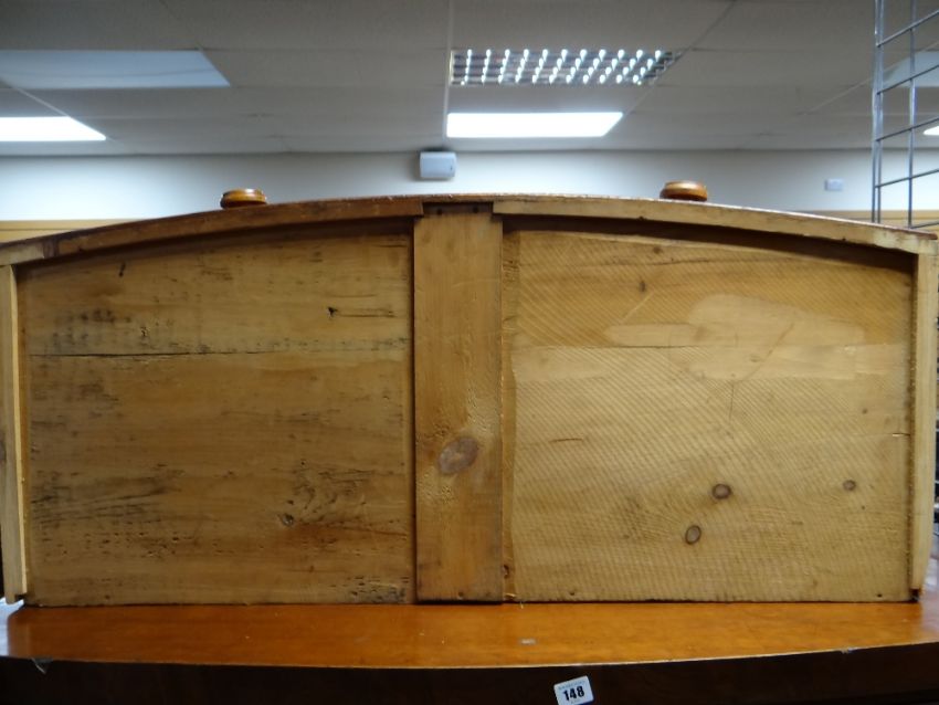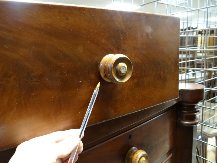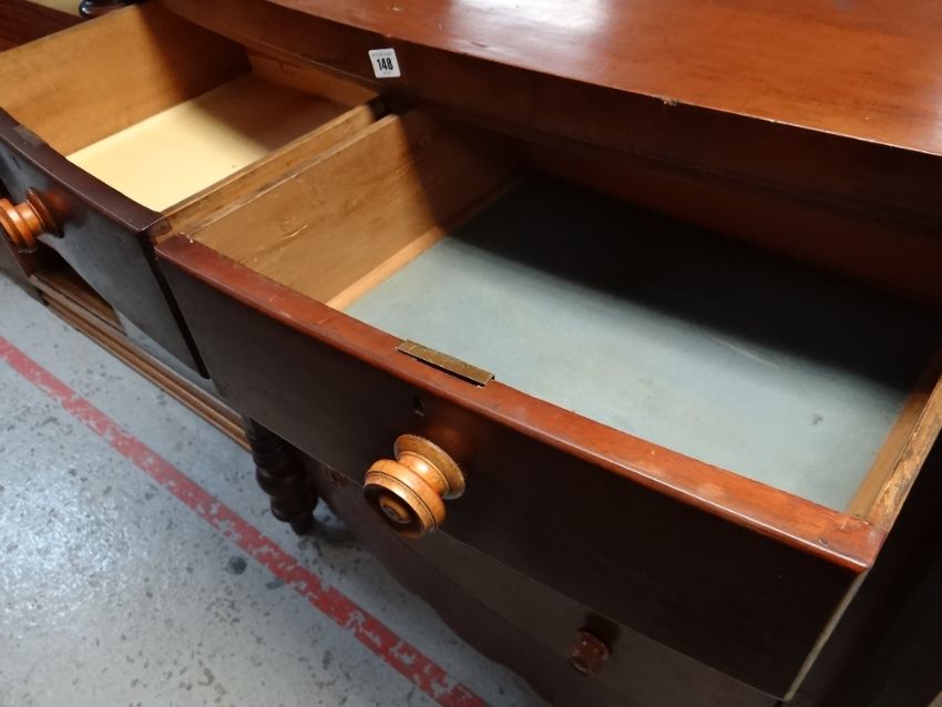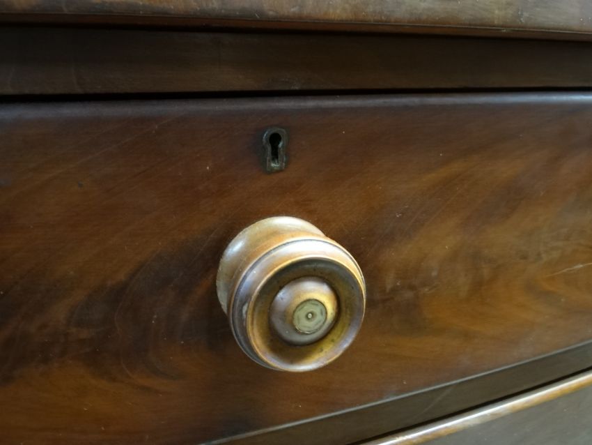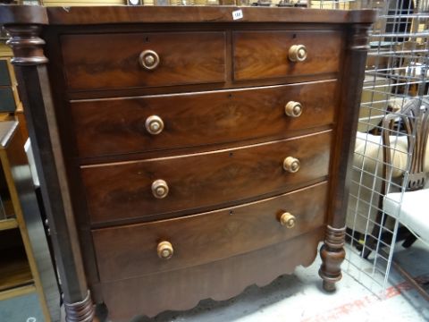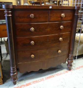 LATE VICTORIAN WALNUT BOWFRONT CHEST with outset octagonal columns and five drawers, shaped apron, 129 x 52 x 132cms COLLECTING ITEMS STRICTLY BY PRE-ARRANGED APPOINTMENT / SAFE DELIVERIES CAN BE ARRANGED (PLEASE ENQUIRE)General wear all over, lots of scratches and chips to the edges.All handles present, one handle on the bottom drawer is a little loose.Two of the five locks look damaged, are not sitting properly. One keyhole is missing its brass insert. No key.Couple of the drawers are quite hard to close.The whole piece does feel a little wobbly.Could not find any worm.