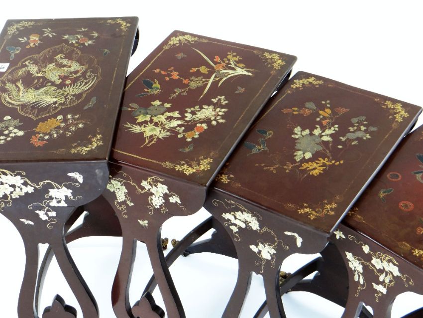SET OF 19TH CENTURY CHINESE BROWN AND GOLD LACQUER QUARTETTO TABLES, each decorated with flowers and insects, the largest with dragon and phoenix, cusped panel, lyre supports, gilded dragon head feet, largest 53 x 31 x 72cms (4)