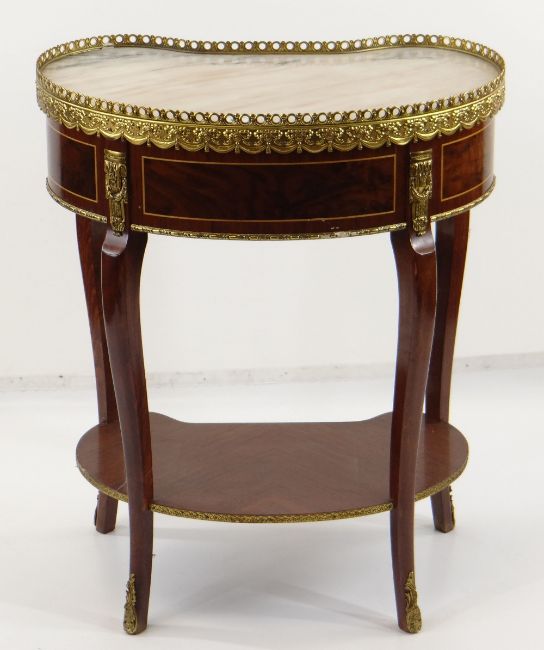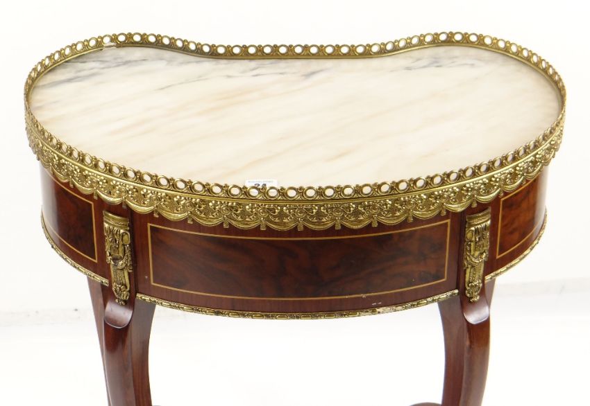 LOUIS XVI-STYLE GILT METAL MOUNTED KINGWOOD & WALNUT MARQUETRY TABLE AMBULANTE, with kidney-shaped marble top, brass gallery 59cms wide