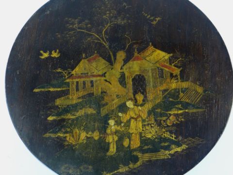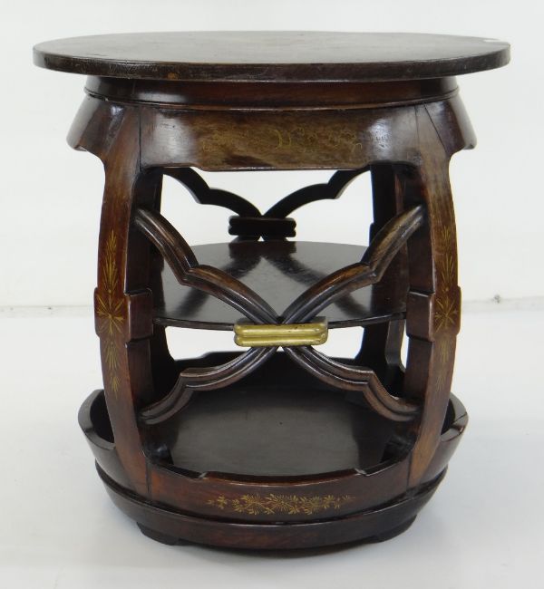 CHINESE HARDWOOD BARREL GARDEN SEAT converted to an occasional table with later japanned top and plain under tier, later gilt decoration, 50 x 52cms