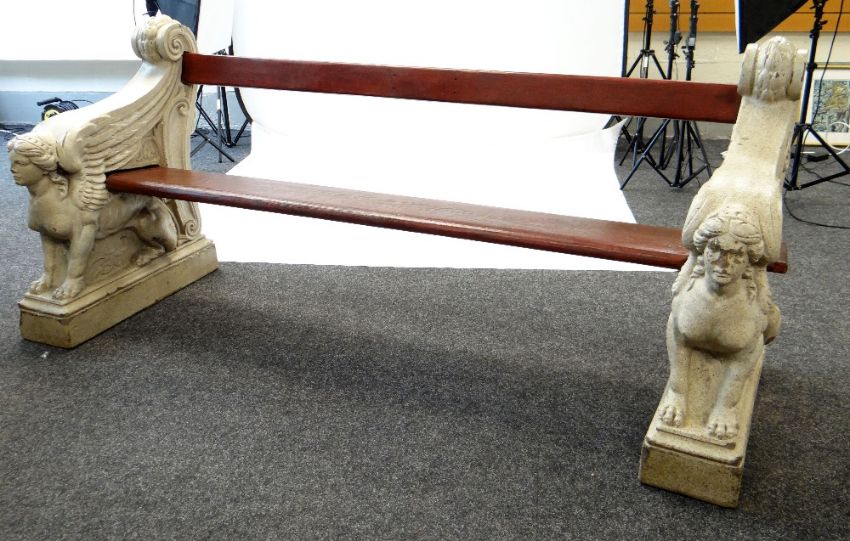 RARE DOULTON GLAZED STONEWARE GARDEN BENCH, c. 1900, the side supports modelled as seated sphinxes, before acanthus and channel scrolled backs with laurel swag embellishments, plinth bases both impressed 'Doulton Lambeth London' in characteristic script, later stained wood seat and back slats, 91 x 76 x 211cms