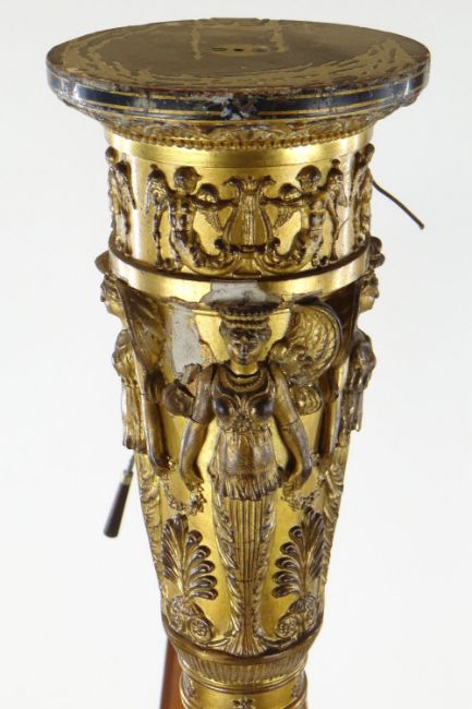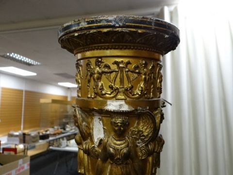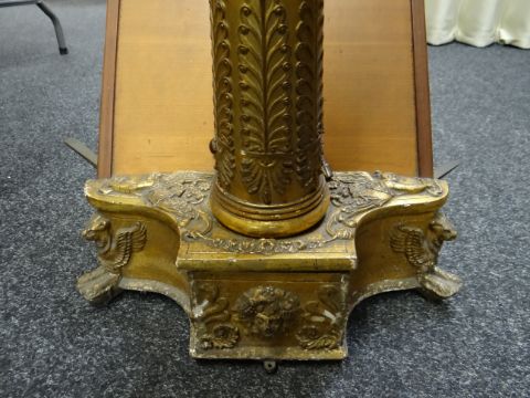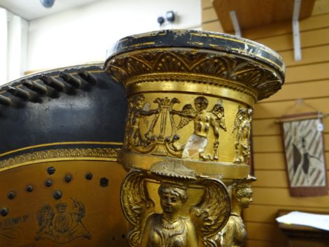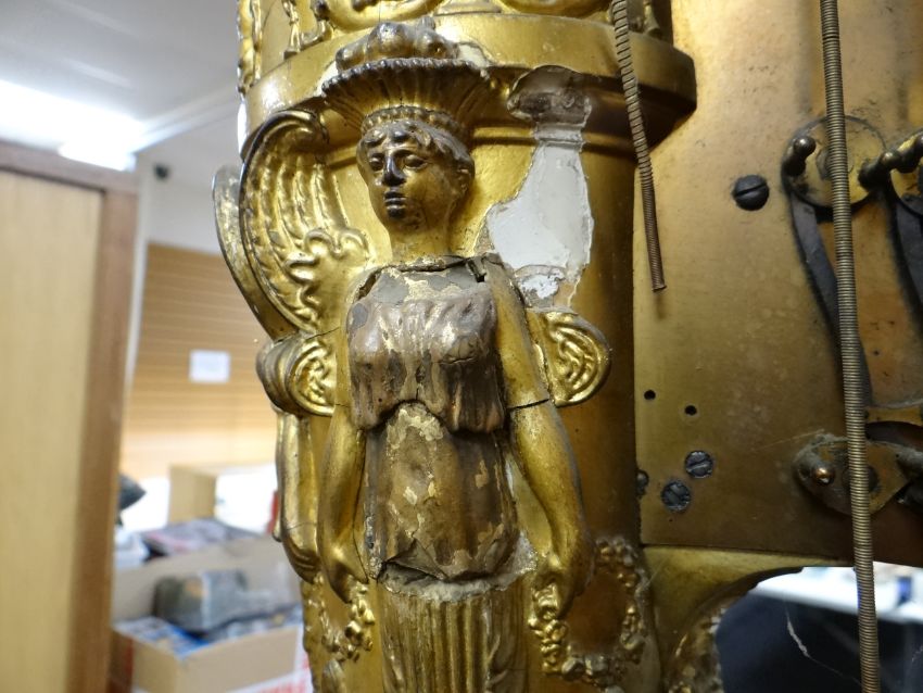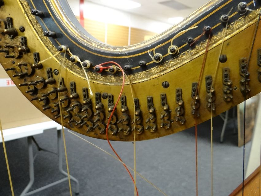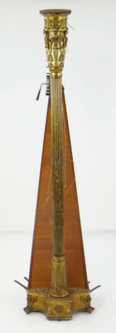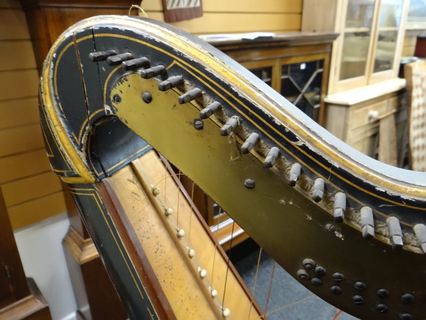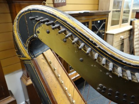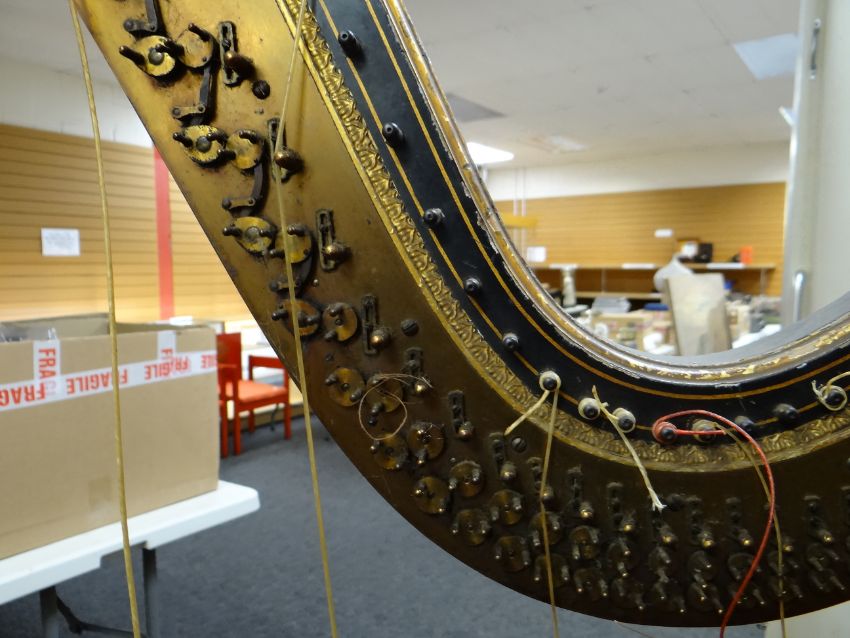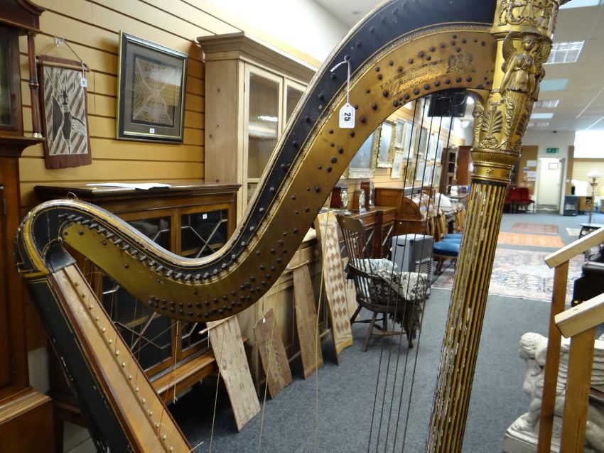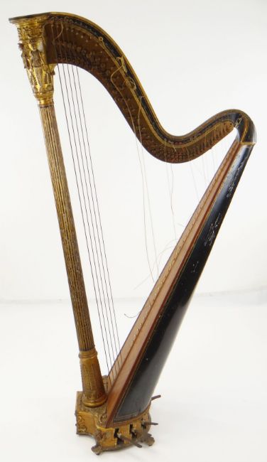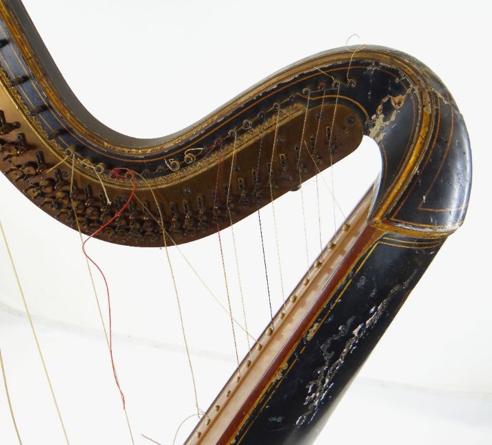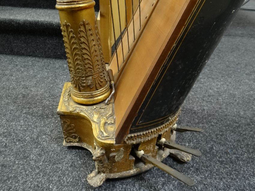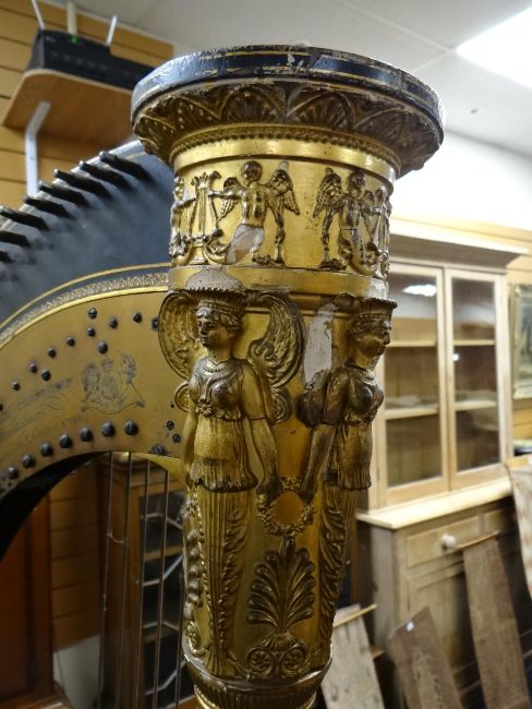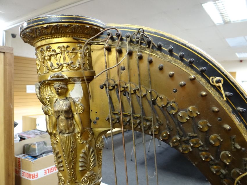 WILLIAM IV DOUBLE-ACTION PARCEL GILT GRECIAN HARP BY JACOB & JAMES ERAT, c. 1830-35, the 43-string harp with figured maple board, fluted pillar topped with lyres, 7 pedals, brass mechanism plate engraved 'J & J Erat, Patent Harp, Manufacturers, 23 Berners Str.t, London' and Royal arms, 171cms high Condition Report: paster losses, worn paint, some opening of joints, many strings broken/lacking, in need of overhaul. COLLECTING ITEMS STRICTLY BY PRE-ARRANGED APPOINTMENT / SAFE DELIVERIES CAN BE ARRANGED (PLEASE ENQUIRE)There are lots cracks and scratches all over.Missing foot pedal