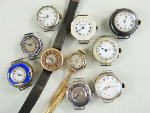 TEN VARIOUS LADIES 9CT GOLD & SILVER WRISTWATCHES, the gold consisting of a half hunter style watch with blue enamel Arabic case numerals, London import marks for 1919, case 26mm diam. (lacks crown) and a Lanco octagonal cased watch with subsidiary seconds, 21mm diam. on 9ct bracelet (broken), the remaining including a half hunter, two guilloche enamelled bezel watches (enamel damaged), two with mother of pearl cases, ETC (damages) (10)