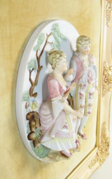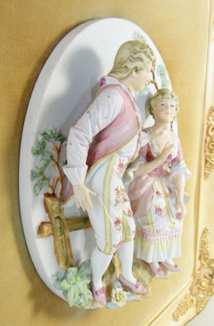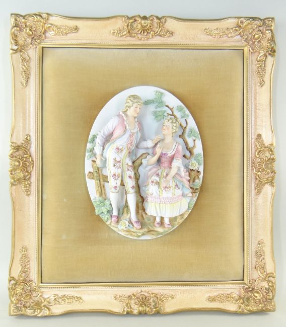 PAIR OF CONTINENTAL BISQUE PORCELAIN OVAL PLAQUES, modelled in relief with pairs of courting couples, circa 1900, mounted on velvet backed frames, plaques 24cms high, frames 46cms high (2)